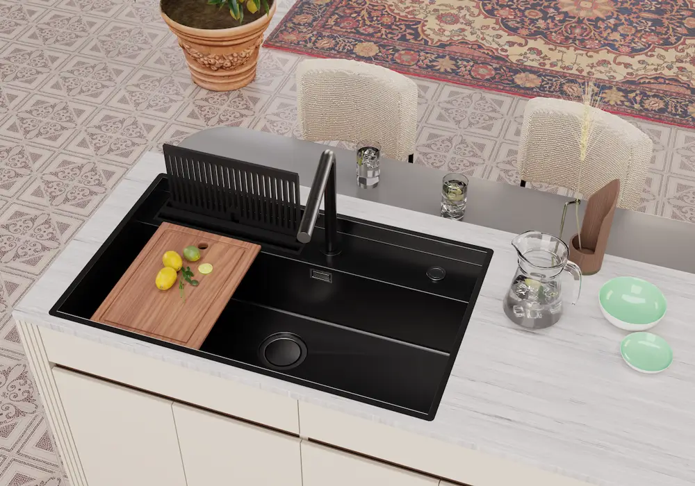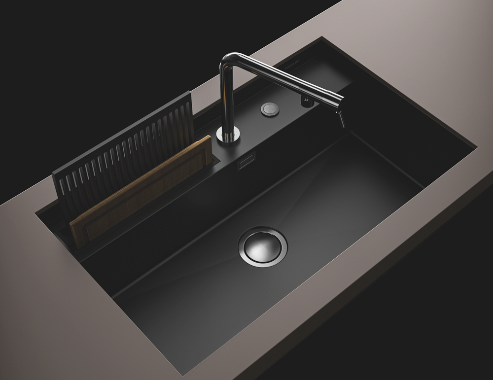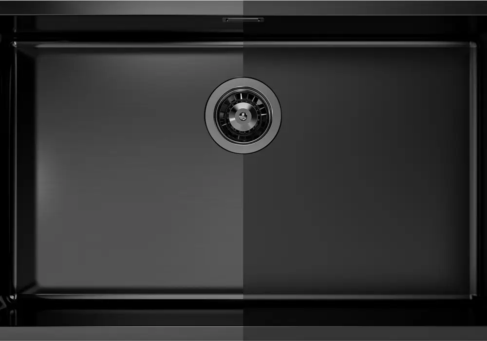 PVD Black is verkrijgbaar in fumé en satijn en biedt twee verfijnde varianten van zwart. Deze afwerkingen passen bij diverse ontwerpstijlen, van minimalistisch tot luxe, en versterken de materialen, volumes en lichteffecten in de keuken.